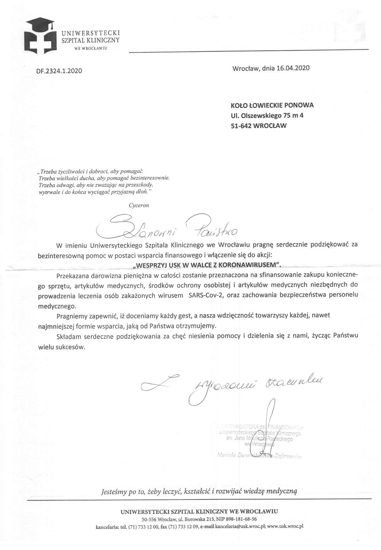 Informujemy, że nasze Koło przyłączyło do akcji: Wesprzyj USK w walce z koronawirusem i przekazało darowiznę pieniężna w wysokości 5000 zł na zakup sprzętu i artukułów medycznych dla Uniwersyteckiego Szpitala Klinicznego we Wrocławiu.